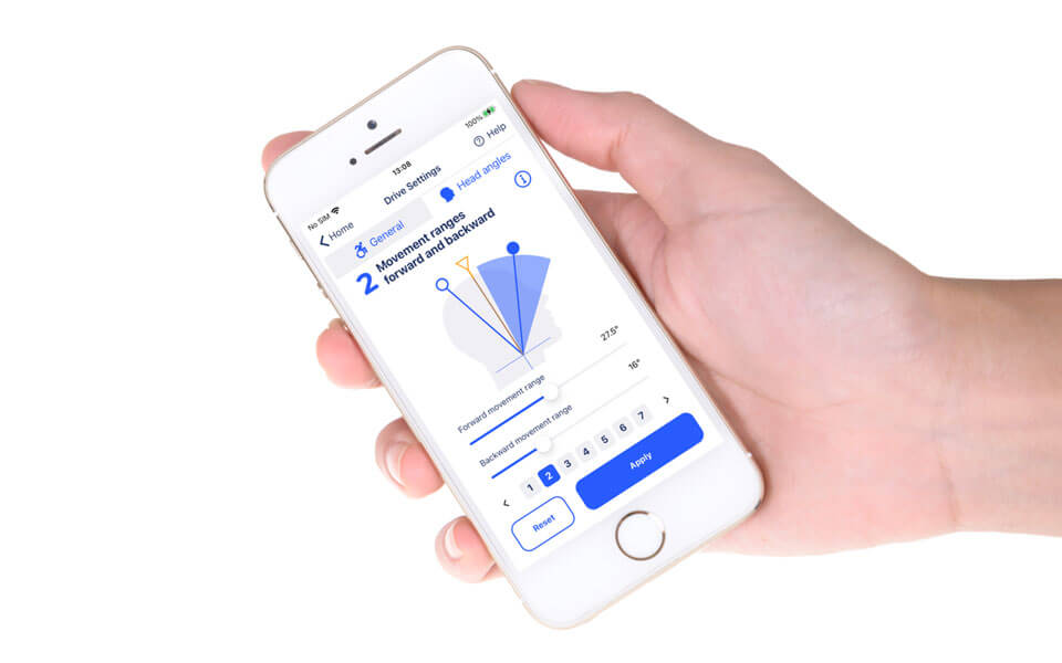 A experiência de condução pode ser personalizada até ao mais pequeno detalhe graças à aplicação para smartphone ou computador. Cada controlo de movimento de cabeça pode ser configurado de forma independente para se adaptar à gama de movimentos do utilizador.