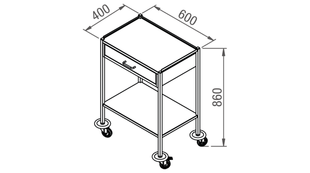Mesa auxiliar fabricado com uma estrutura em aço inoxidável com gaveta em inox e acabamento pintado.