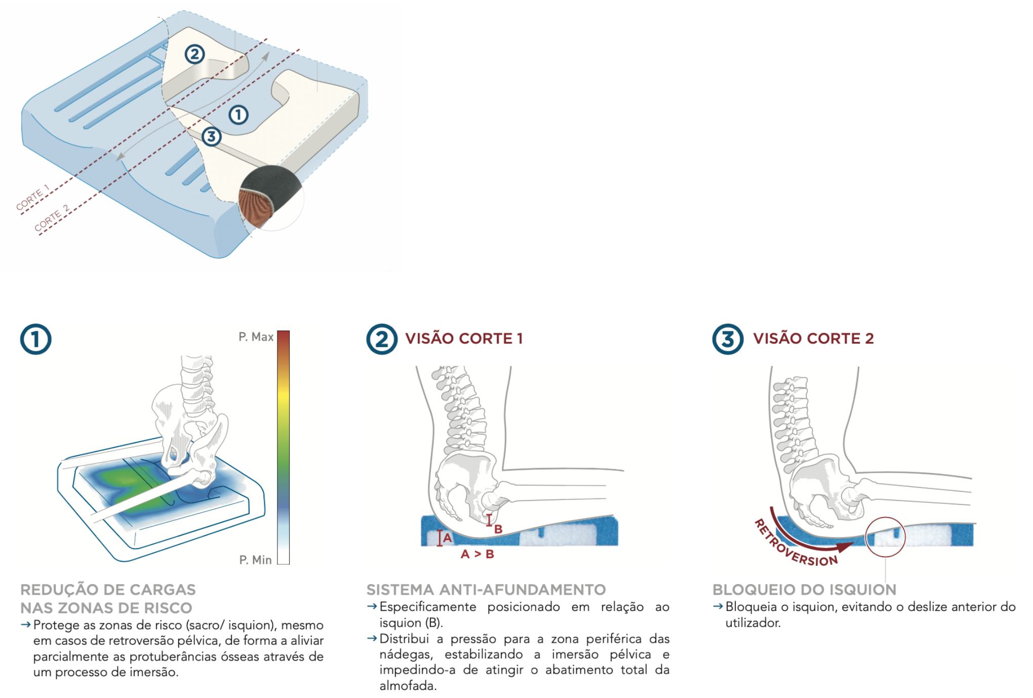 • Forma anatómica com bordos laterais elevados e declive ântero-posterior, favorecendo o alinhamento postural, aumentando a superfície de contacto e reduzindo a pressão nas áreas críticas.