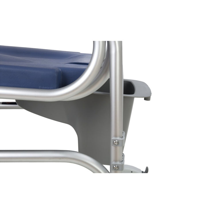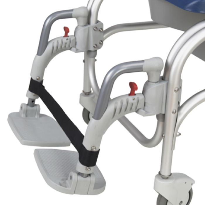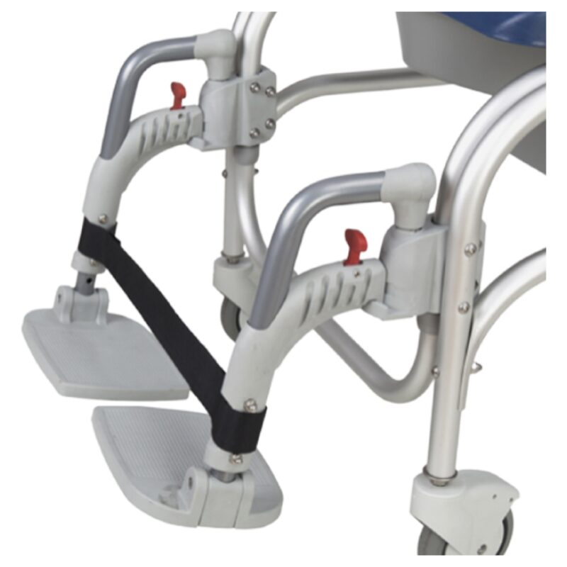 Dispõe de patins de apoio para os pés com abertura bilateral, destacáveis e rebatíveis para dentro e para fora. Os apoios de braços são rebatíveis, facilitando as transferências laterais do utilizador.