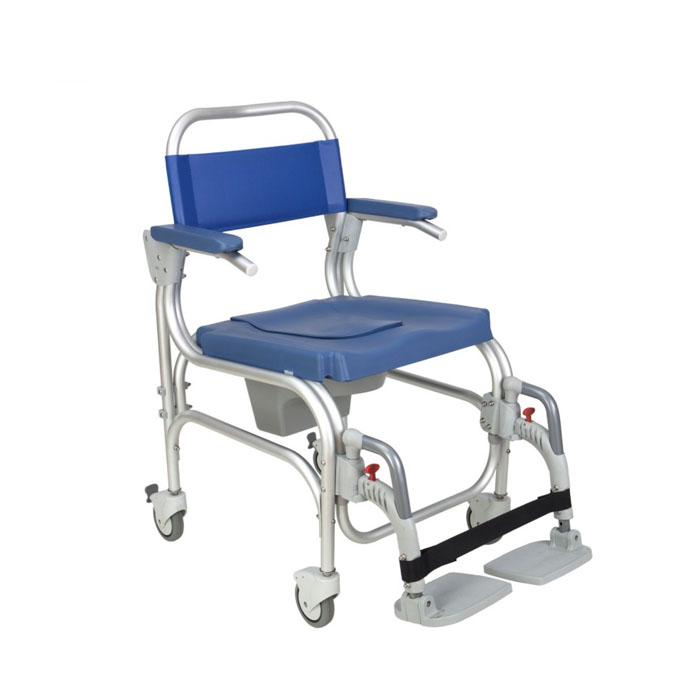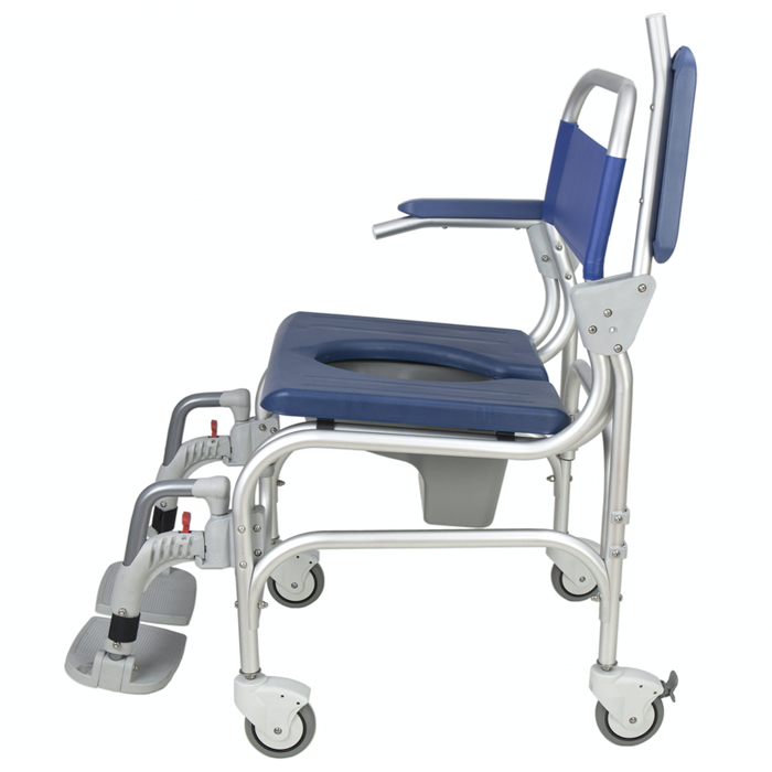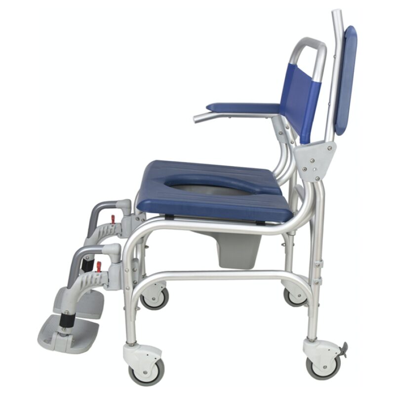 Cadeira sanitária e de banho em alumínio, equipada com 4 rodízios de 100 mm de diâmetro (2 com travão), garantindo facilidade de deslocação e segurança.
