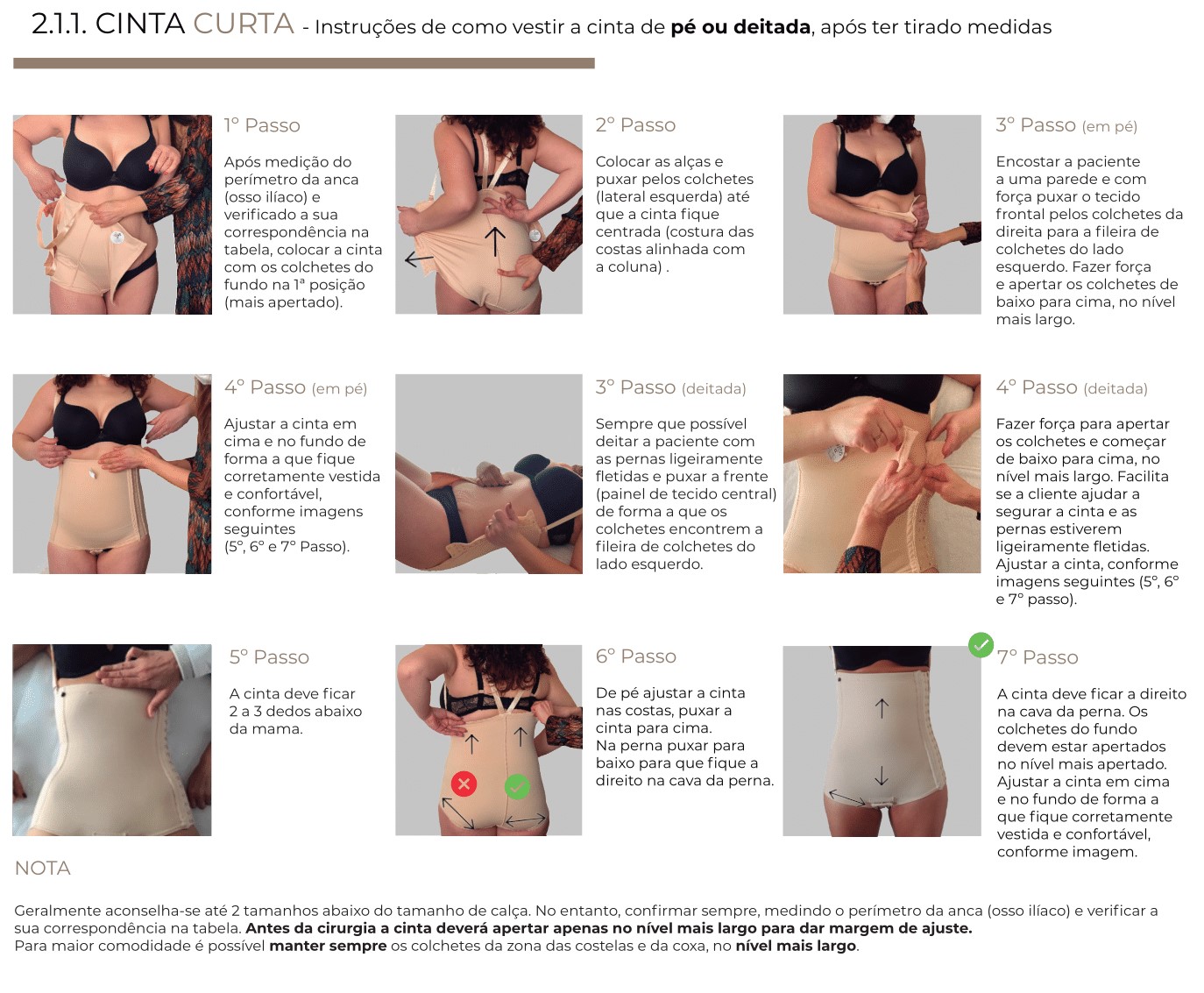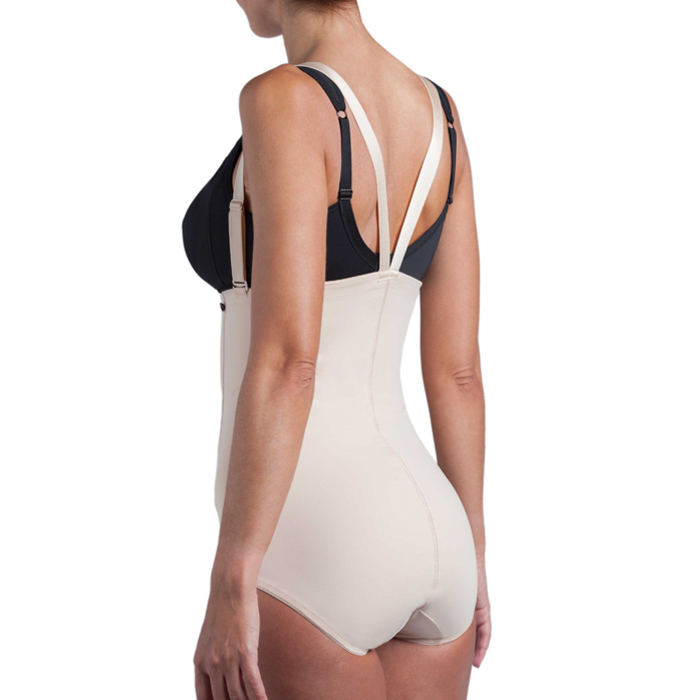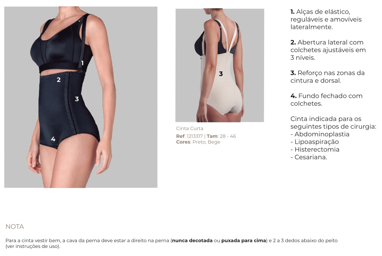 Cinta de malha compressiva que auxilia na recuperação ajudando a diminuir o edema e a inflamação da parte intervencionada, proporcionando conforto para a paciente e exercendo uma compressão forte e constante modelando as zonas dorsais e do abdómen duma forma eficaz.