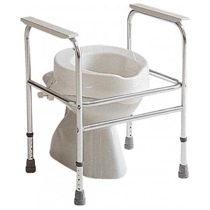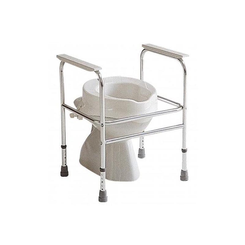 Quadro para sanita em alumínio anodizado não corrosivo. É regulável em altura, tem apoio de braços para um maior conforto e pode utilizar-se com elevadores de sanita.