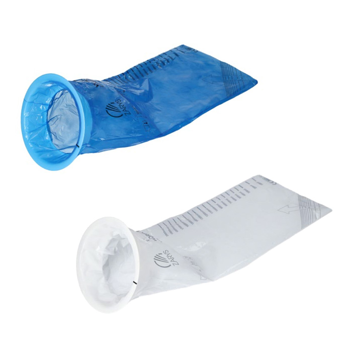 Saco de vómito fabricado em película azul transparente e resistente, permitindo a visualização das secreções.