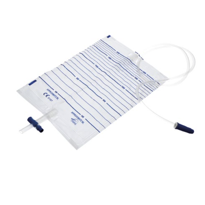Saco coletor de urina com capacidade de 2000 ml, isento de látex, fabricado em PVC com 0,22 mm de espessura e parede dupla, garantindo maior resistência e segurança.