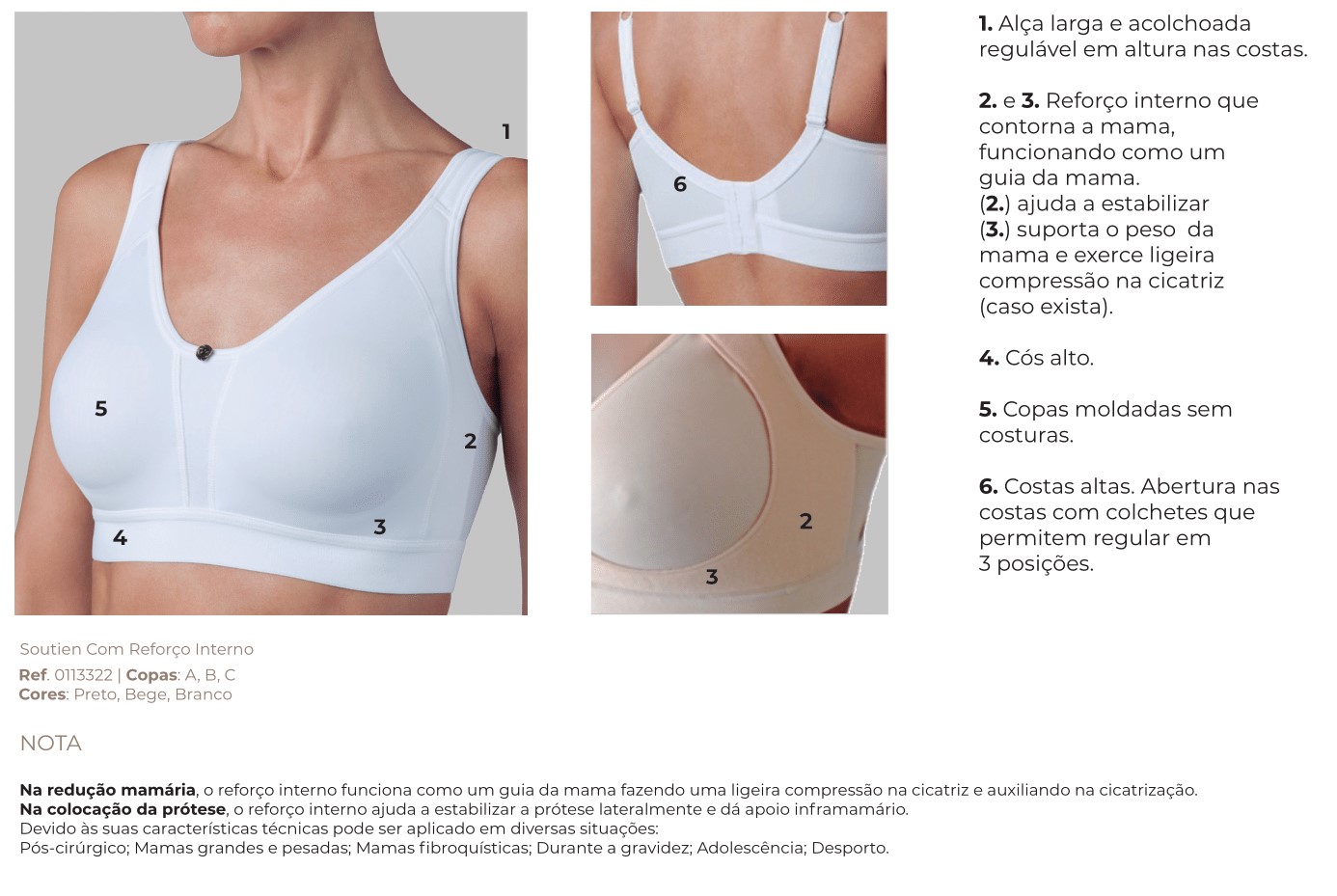 Soutien pós-operatório com reforço (2ª fase) – abertura nas costas. Auxilia na recuperação, ajudando a diminuir o edema e a inflamação da parte intervencionada. Tem um bom suporte o que permite uma melhor sustentação do peito, proporcionado maior conforto.